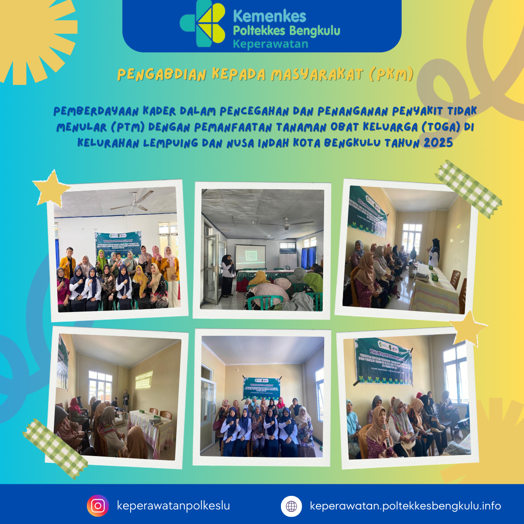 Bengkulu, 31 Agustus 2025 – Dosen Jurusan Keperawatan dan Kebidanan Poltekkes Kemenkes Bengkulu kembali menunjukkan komitmennya dalam mewujudkan Tri Dharma Perguruan Tinggi melalui kegiatan Pengabdian kepada Masyarakat (PkM). Kegiatan tahun ini mengusung tema “Pemberdayaan Kader dalam Pencegahan dan Penanganan Penyakit Tidak Menular (PTM) dengan Pemanfaatan Tanaman Obat Keluarga (TOGA)” yang dilaksanakan di Kelurahan Lempuing dan Nusa Indah, Kota Bengkulu.